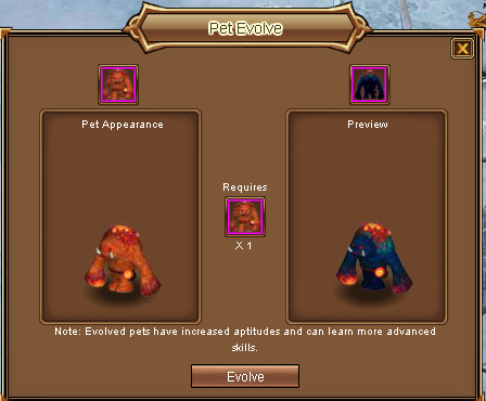 Note: The pet level, skill and enhancement level will be reset once being evolved. Please think twice before do it.