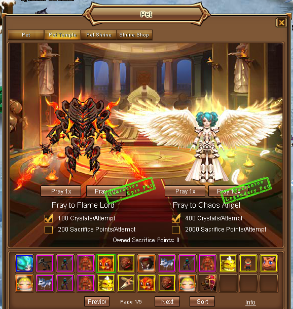 - Pray to Flame Lord to randomly obtain Pristine or above, up to Legendary pet.