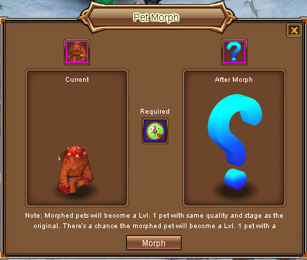 - Morphed pets will become a Lvl. 1 pet with same quality and stage as the original.