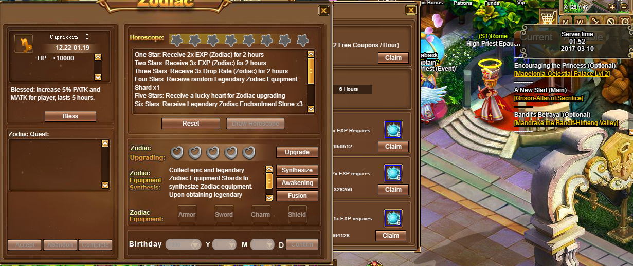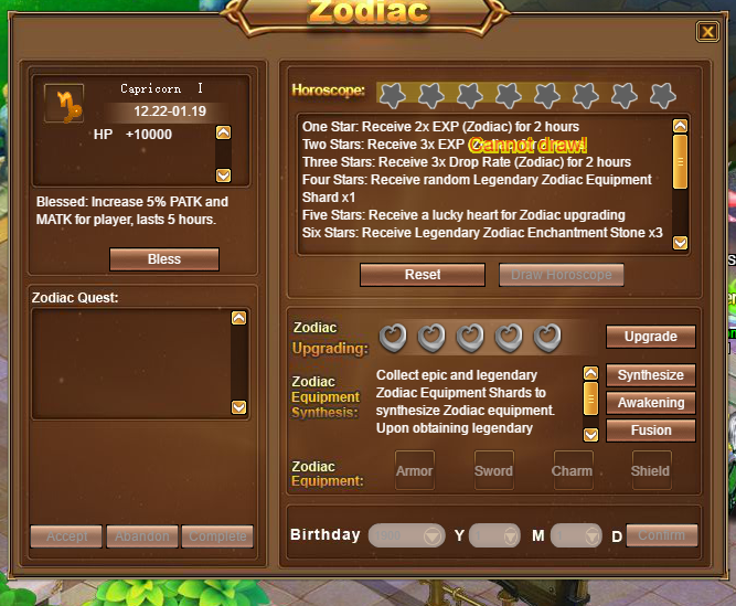 Draw wasn't ok for me I had to reset horoscope in order to draw, however quest seems to be bugged as since I completed the first one it won't show. I'll check it, if you guys still have your quests bugged after 24 hours please do submit a screenshot.Originally posted by bkeeen1 View Postzodiac horoscope draw is fine as it is just the quests arent