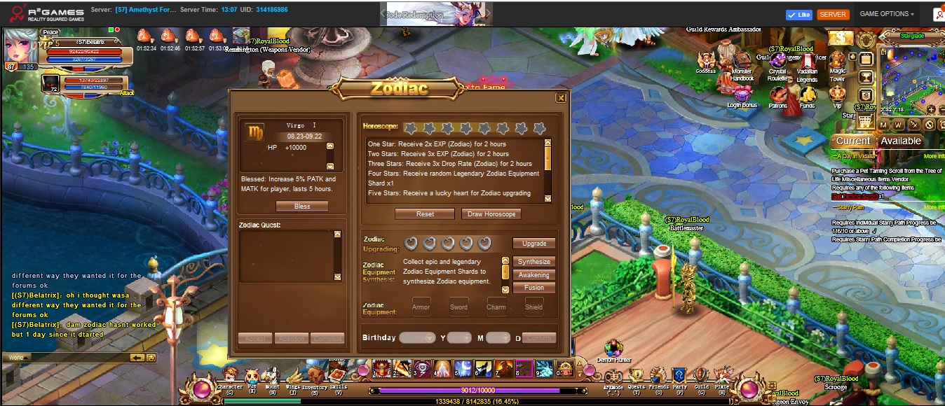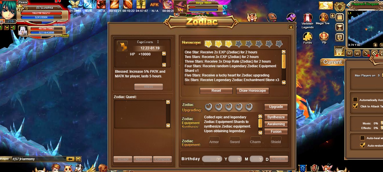 It was just stated that Zodiac quests are bugged. The relogging suggestion was made for the Horoscope draw.Originally posted by bkeeen2 View Posti tried relogging, but still no quest. and include the hellstorm levl 81-120 bug too , i think they should make two hellstorms 80 below and 81 above like avernal, ty reverie for the assistance, i hope they work it out asap