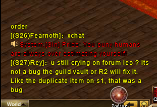 The fact you're a wars member has nothing to do with that tho huh lol? To answer your question, screenshot was taken from an alt which is not breaking any rules so you can forget about barking up that road, you and your guildies are quiet pathetic. I see now S(27) has no gears equipped and just like yesterday when he reequips will have divined gear. Save your treats for someone that cares, already one of your guilds characters are deleted. Don't worry I will be monitoring you all the time and report you as I see fit each time. Cheaters never prosper, there is no "fancy" terminology used , your vocabulary is just limited. That grammar and spelling of yours gives you away every time Terra, the same in guild chat you cant spell to save yourself.
