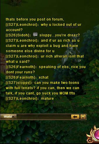 You guys are patheticOriginally posted by R21916586 View Postim not apart of any guild in question im just aperson on the server that views you as a person thet doesnt get milk from mum anymore just like to be a bully i also hear that people are making lvl 1 alt and constanly harrassing females calling them awfull names and i hope the report the players have sent with screen shot of the alternate doing this vile act get punished as r2 do have logs of any chat in game and ip linked to that screen name