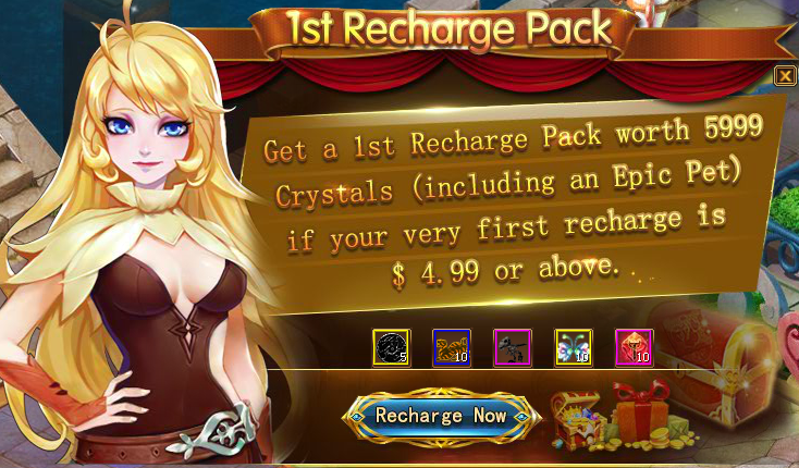 Description: Get a New Server 1st Recharge Pack If your very first recharge is $ 4.99 or above.