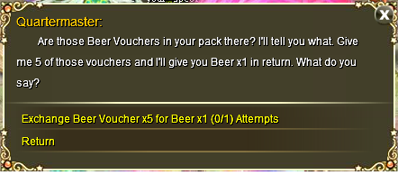 Description: Defeat Lvl. 30 and above elite monsters for a chance to receive a Beer Voucher. Collect 5 of these vouchers and exchange them for a Beer x1 from the Quartermaster in Starglade, 5 times per day. Beer Vouchers cannot be traded.