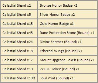 Hmmm.. Celestial Shard x17 for mount upgrade token... is cruel, its useless since the game is already on its 3rd year, we would appreciate it if this will be changed to Greater Mount Upgrade Token.Crystal Saga