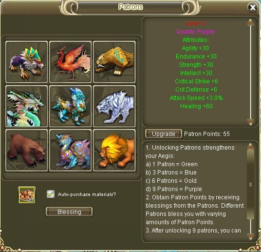 - Patrons - Defeat level 60+ Dungeon Bosses for Patron Tribute, which can be used for upgrading an Aegis that gives you stat bonuses.