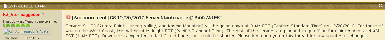 Servers [S1, S2, S3, S4, S5, S7, S8, S9, S16, S20, S52, S55, S57, S59, DPS1-S3, Joyopark-s6-s8] will be going down at 4 AM EDT (Eastern Dalight Time) on Thursday, November 26th. For those of you on the West Coast, this will be at 1 AM PDT (Pacific Daylight Time). The rest of the servers are planned to go offline for maintenance at 5 AM EDT (2 AM PDT). Downtime is expected to last 3 to 4 hours, but could be shorter. Please keep an eye on this thread for any updates or changes.