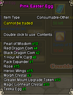 I agree that the timing is wrong for the event, last Easter it was for 2 weeks I believe. The Yellow packs its the better one its has Beast Soul, Polished Note, Patron Tributes etc you can also always sell what you don't wantOriginally posted by HydraNazgul View PostThere isn't exactly great things in the eggs that would require being bound xD