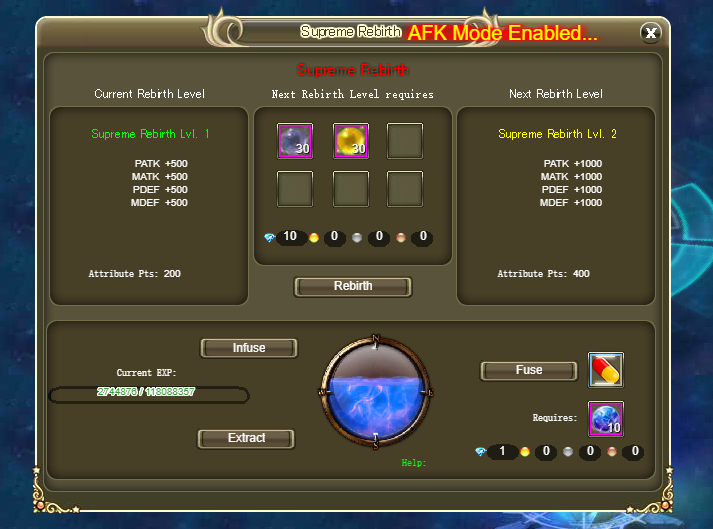 the cost to rebirth is affordable np. What people wanna know is that if it will cost to lvl more after rebirth, it shows it has a supreme rebirth lvl with added stats r2 love to make us pay for stats so will that cost per lvl. Or does the stored up exp it has on bottom allow us to lvl up freely?Originally posted by miaculpa View Postit takes 10.800 and 10p jst to rebirth.... and yo can do it times... so have fn overdoing it ... let's say now i remember why i was happy i got lvl 180 finally....