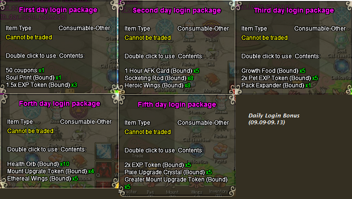 - Log in on 9/13 to collect 2X EXP Token (Bound) x5, Pixie Upgrade Token (bound) x5, Greater Mount Upgrade Token (Bound) x5