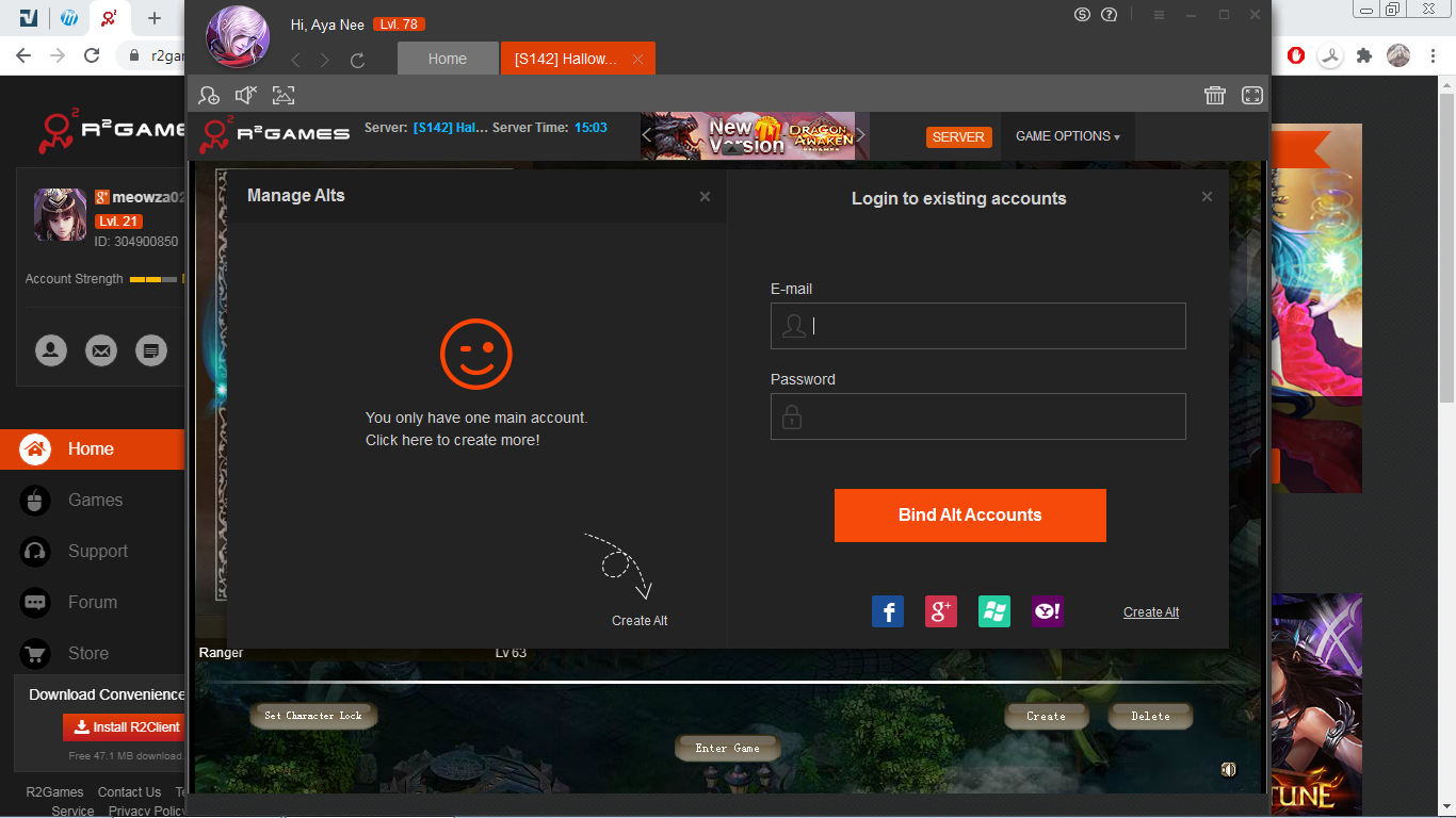 So I'm going to alt page in client, clicking Google+ login, it brings me to login screen, i try to enter my info, then it tells me it's not secure and nothing else happens. The char is (S120)Gaia, a lvl22 knight. Browser login works just fine. Please, look into this, because I would love to use my alts in a client. Thank you.