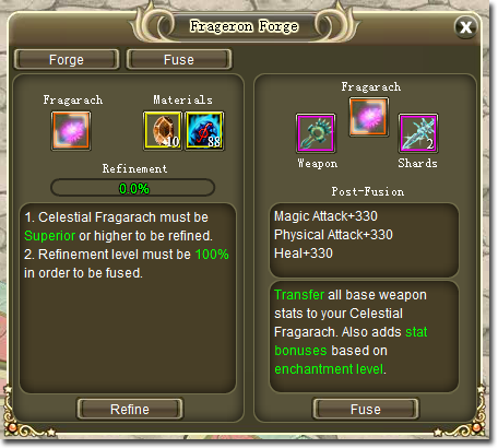 Looking to further improve your Fragarach? With the new Fragarach Fusion system, you may now transfer weapon attributes to your Fragarach! In order to fuse weapon stats to your Fragarach, your Fragarach must first be refined to 100%. For every refine attempt, 10 Purified Crystals and 88 Fragarach Refinement Crystals are required, in which the refinement level will be raised by 2%. Once your Fragarach has reached a refinement level of 100%, it may then be fused. Fragarach fusion requires your Fragarach, any weapon (that can be used by your class) and 2 Fragarach Shards. Fragarach Refinement Crystals may be purchased in the Item Shop. For more details on this new system, simply click the Frageron Forge button in your Inventory.