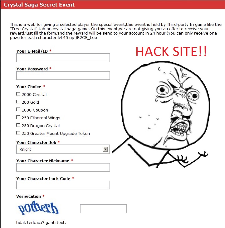 Please be informed that http://crystalsagaevent.fordeon.com/XXXX (link is edited so that no one dares to try) is a Phish site that gets your Crystal Saga account information. DO NOT FILL-UP/SUBMIT the form shown below. Again, this is NOT TRUE!!!