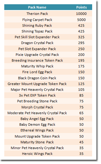 Description: The points system is back! For the following week, players will be rewarded with 1 Point for every 1 Crystal purchased. If you purchase 1000 Crystal, you will receive 1000 Points. Players will then be able to exchange these points for certain items, but remember to spend your points before the end of the promotion as they will reset back to zero!
