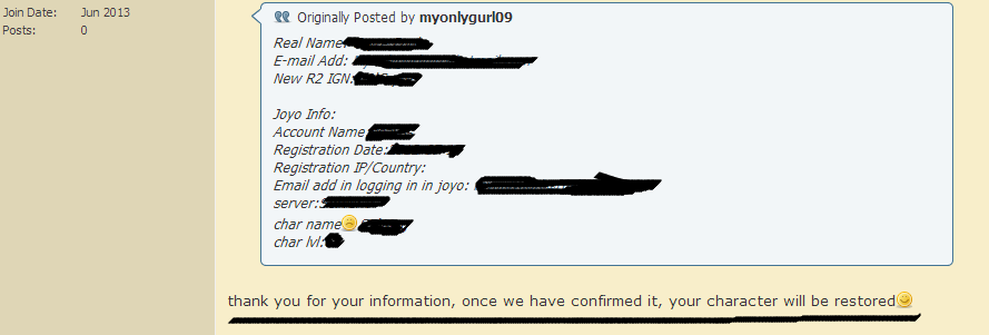 might work both ways. but all the accounts that are not bound with facebook that my friends had, have already been restored that way. and i think if you have time to reply to it, you also have time to delete your personal information from the forum. but guess the possibility of hacking wont bother you. i believe if you dont do it the way you're asked to do it your character wont be restoredOriginally posted by jham18 View Postshallyna's account is not binded so i can restore my account using that email from joyo