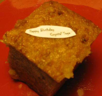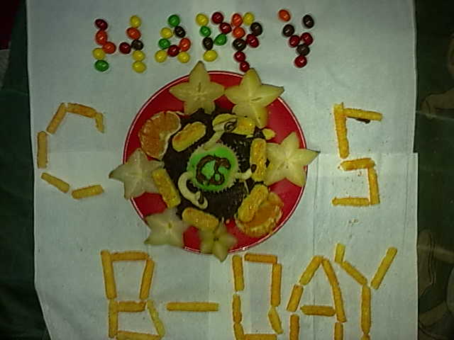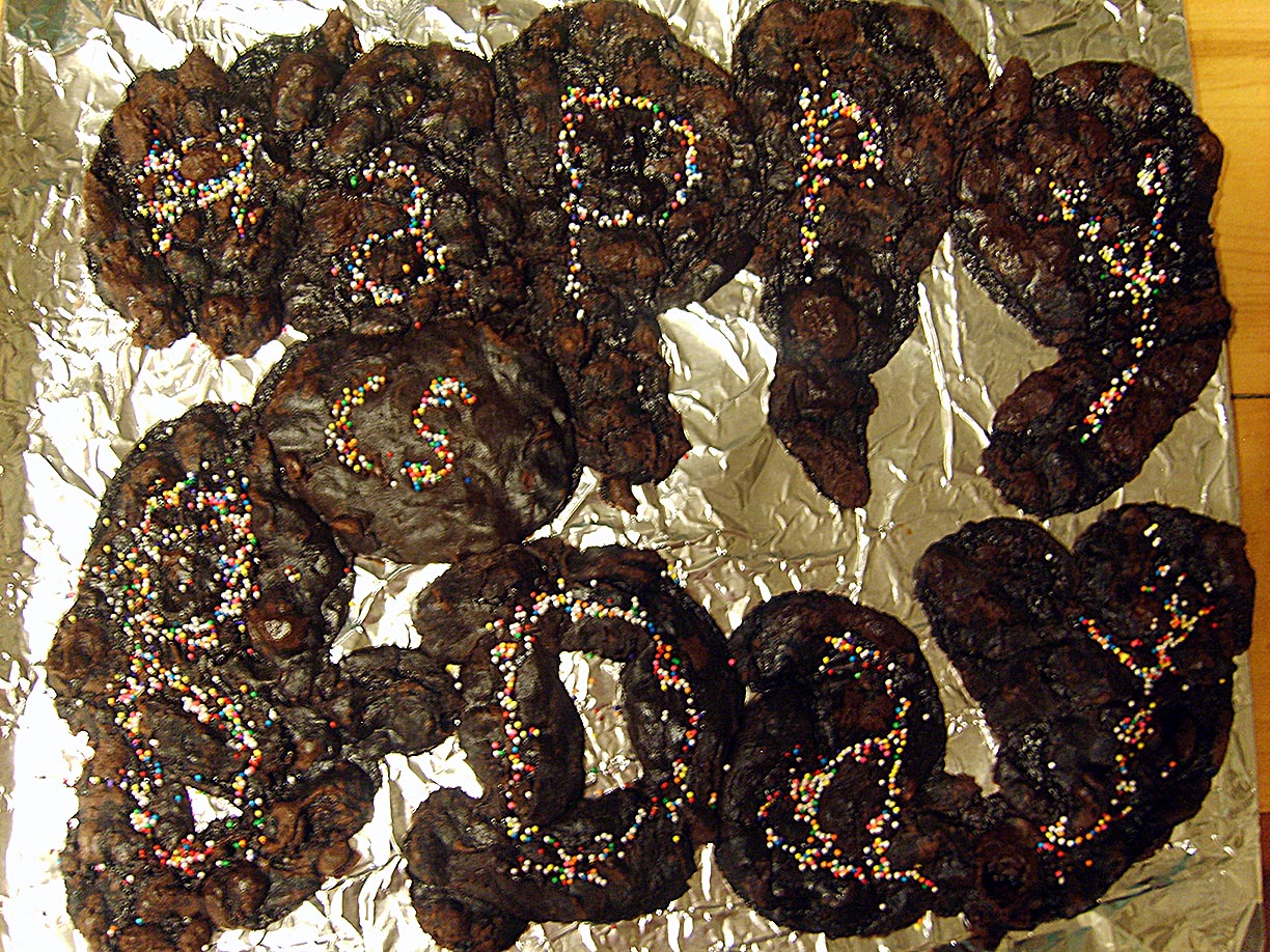 This didn't work out the way i wanted it to; I shaped the letters out of thickened brownie mix, but they did not keep their shape. I also had the nonpareils neatly lined up to make the letters look better, but they got kind of screwy, especially the B. Anyhoo, HAPPY BIRTHDAY CS!