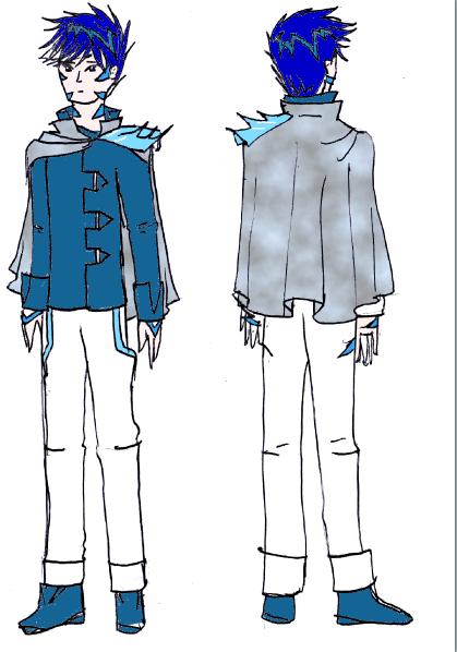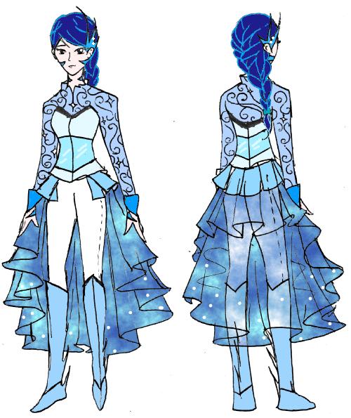 These are the Winter Warlock costumes. Both have light blue tattoos that could be more intricate and go on the headpiece if possible. The male clothes would look better on the template, these legs are too long! The short cloudy cape is meant to make him look gorgeous