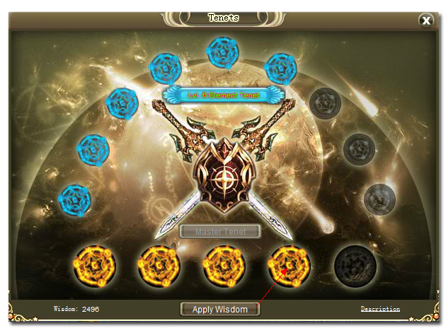 Click "Apply Wisdom" to learn new components. When all 5 components of a level of Tenet have been learned, the attributes gained will be saved. Players can then learn the components of the next level of that Tenet. There are 9 levels of each Tenet.