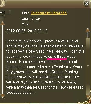 Description: For the following week, players level 40 and above may visit the Quartermaster in Starglade to receive 1 Rose Seed Pack per day. Open this pack and you will receive up to three Rose Seeds. Head over to Bloodfang Village and plant these seeds within the Event Area. Once fully grown, you will receive Roses. Planting one seed will yield two Roses. These Roses will award you with 10 Charm points each, which may then be used for the newly released Goddess system.
