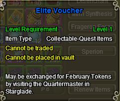 Description: Defeat level 30 and above elite monsters for a chance to receive an Elite Voucher. Collect 10 of these vouchers and exchange them for February Token x1 by visiting the Quartermaster in Starglade, once per day.
