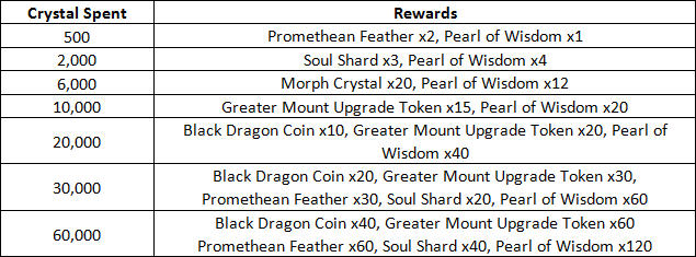 Description: During this promotion, use your Crystal to purchase items in the Item Shop and receive a number of unique rewards! Rewards are based on total Crystal spent during the duration of this promotion – NOT total Crystal purchased. Once you reach the requirements below, visit the Quartermaster in Starglade to receive your extra reward.