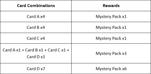 Note: Players may receive ONE Card Pack per day, VIP players TWO Card Packs. All cards can be traded. Mystery Packs can also be purchased in the Shop for 98 Crystal.