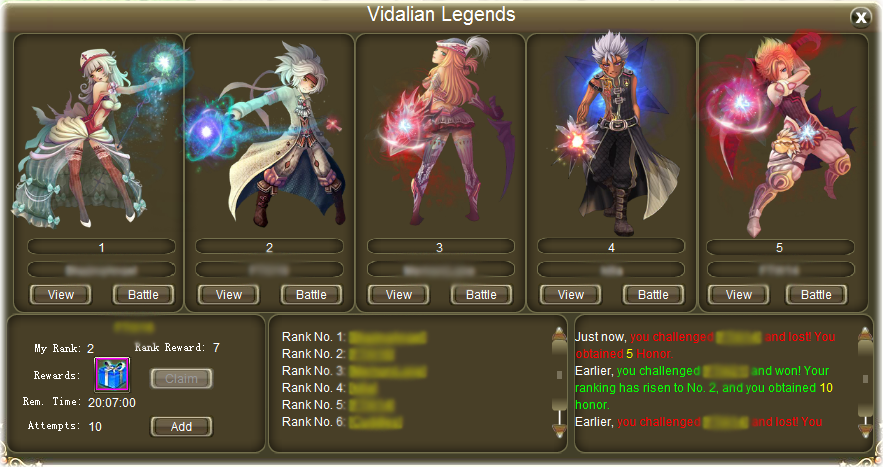 - Each player will have 5 enemies available to challenge, which will change depending on the rankings. The name, level, and rank of available opponents should be displayed, and you can view additional info by clicking "View".