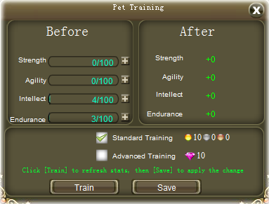 3. Click [Train] to train your pet, refreshing the value of stats in the [After] column.