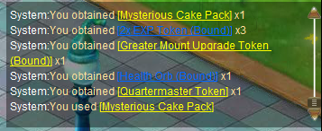 Description: Every day a large and mysterious looking cake will appear at 19:00 in Starglade (L1) for three hours. Help yourself to some cake and receive a Mysterious Cake Pack, once per day. Each pack contains TWO of the following: