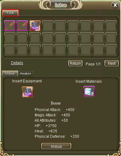 All items that you can Imbue that are in your inventory will show in the Pack area of your Imbue window.