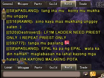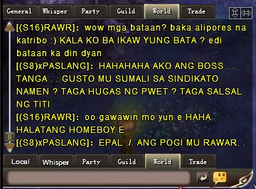 ID:	1733384 its in our server zensho island, you wont understand it because its tagalog or filipino language, but if its translate in english its trashtalk, only xPaslang is trashtalker in our server, tagalog language