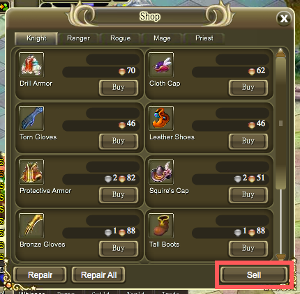Once you find one, click on 'Trade', and then find the button 'Sell' at the bottom right corner of the shop panel. Then you are feel to sell whatever you like in your inventory. Some exceptions are things like Savage Amor sets, things that cannot be sold. Do not get too carried away though, and sell something you need by accident! You cannot get what you sold back!