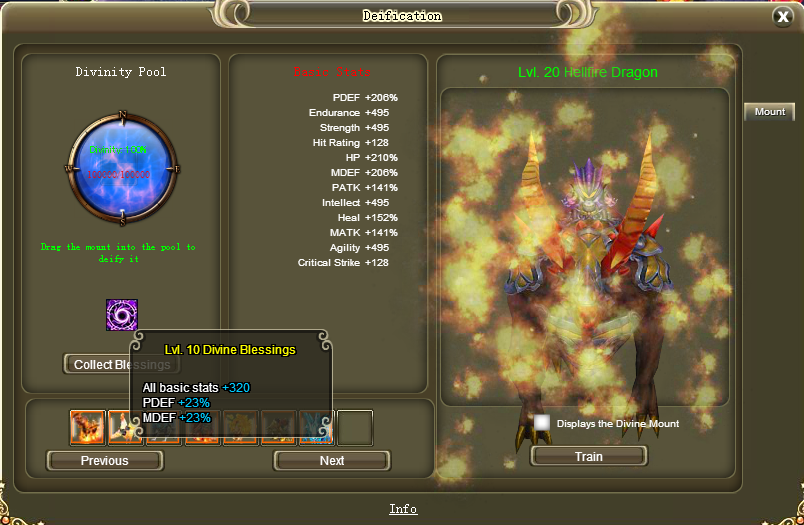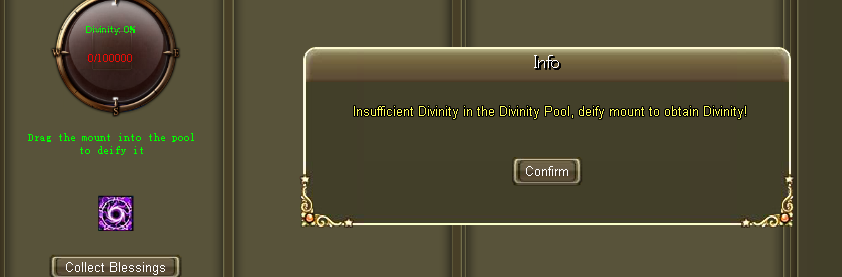 1 crystal = 1 divinity point. So a 999 crystal mount gives you 999 points or 1%... The maximum is 100,000 or 100%. It's said once the Divinity pool is filled up or let's assume at this moment that it means 100% then it gives you a Divine Mount. The question is, will the divine mount change the appearance of your mount? Yes, if you click "Display the Divine Mount option" it will display the Divine mount over any mount that you are currently equipping.