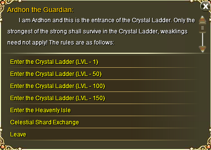 A mystical tower has appeared in The Tree of Life! Legend has it this tower is a magical ladder to the heavens that the Ancients called the "Crystal Ladder". Be forewarned: it's not a place for the weak! Only the strong who survive shall be rewarded handsomely. - Ardhon the Guardian