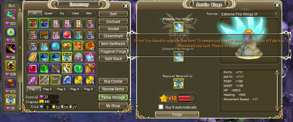 i've agree what you had said, its normal if its failed and gets over then 9 star sometimes. but if its every times its not normals. for ur information, i will make sure atleast everyday i get 1 lvl up for my wing. and that why i found it like success rate is drops. before this its normal i gets 7 star, just after new events the success rate become like dropping. and lately to get 1 lvl up i need atleast 300HW not before this, just used about 1xx only.