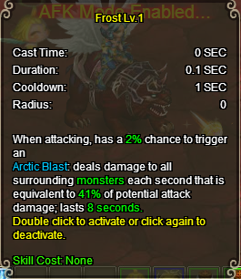 Here's how to activate it. I just wanna clarify how to activate the frost skill. pull up your skill windows by clicking "V" then look at the very bottom of the skill window. You will see there default skills which is the normal attack lv1 and FROST LVL1. drag the frost skill lvl1 on your skill bar and then click once to activate it. An activated Frost skill status will added on the upper right where you can see active elixirs, skills, and tokens... You will see Frost skill lvl 1 (N/A) added to it.