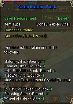 The Guild Contribution Pack is Pack that you can get from the Guild Manager in Starglade . You need 30 Contributuions Points & And a Guild . There is also 60 for a teeka Egg (Bound ) ,SoT for 180 , Pet Skill Expander Etc.