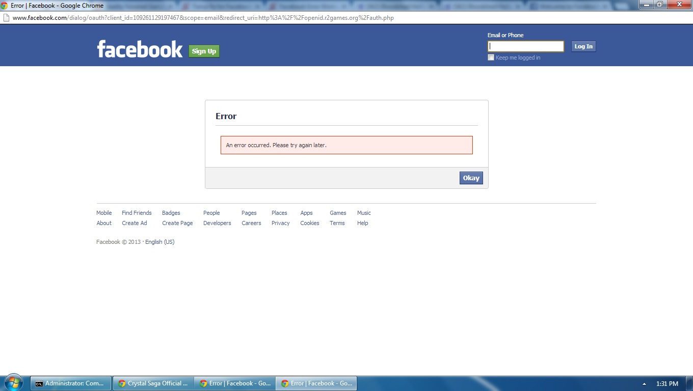 I'm getting the same message, and it's not via Facebook, it's the facebook link from the r2 page that gives the error