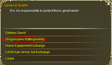 You can get in at the Dragonspine battleground by clicking at General Krahn, at Starglade.