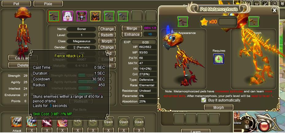 Each time you morph the Pet the basic skills will increase 1 level and your aborbstion stat will increase 5% or 7% on last morph
