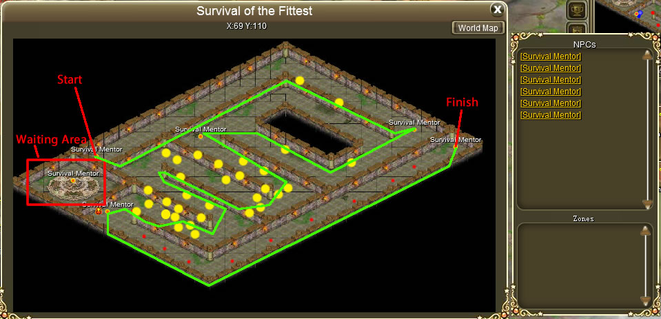 Red dots (not labelled as some kind of NPC are wolves in the maze that are mobs that can kill you the most; other enemies not that important nor threatening, just annoying).