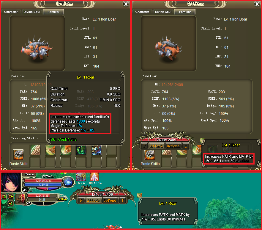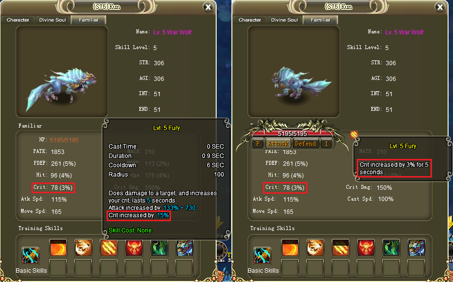 Another bug, the skill Fury for the War Wolf is bugged. The skills says that, when active the Familiar recieves +15% Crit. But when cast the skills says +3% Crit. Furthermore, when viewing the Familiar it shows that the skill infact gives +0% of anything. I thought that maybe it increased the players Crit % instead but it doesn;t do that either.