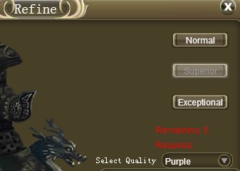 The image shows that for superior refine "Requires:" appears in red text followed by a blank space. There is no mention of the 80 gold cost. The same problem occurs on the Exceptional refine with no mention of the crystal cost.