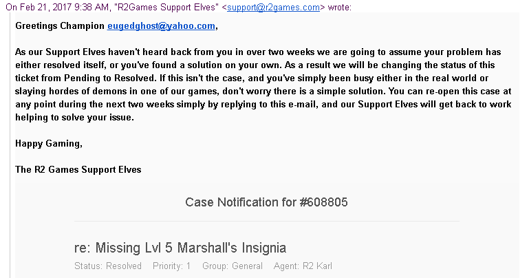 It has been almost three weeks since I sent my ticket re: Missing Lvl 5 MArshall's Insignia with reference Case # 608805 but until now, I haven't heard from them yet. Should I send another ticket for the devs as a follow-up or just wait? Again, i'd like to seek your help on this matter. Thank you so muchLast edited by hyujeen; 02-20-2017, 09:15 PM.