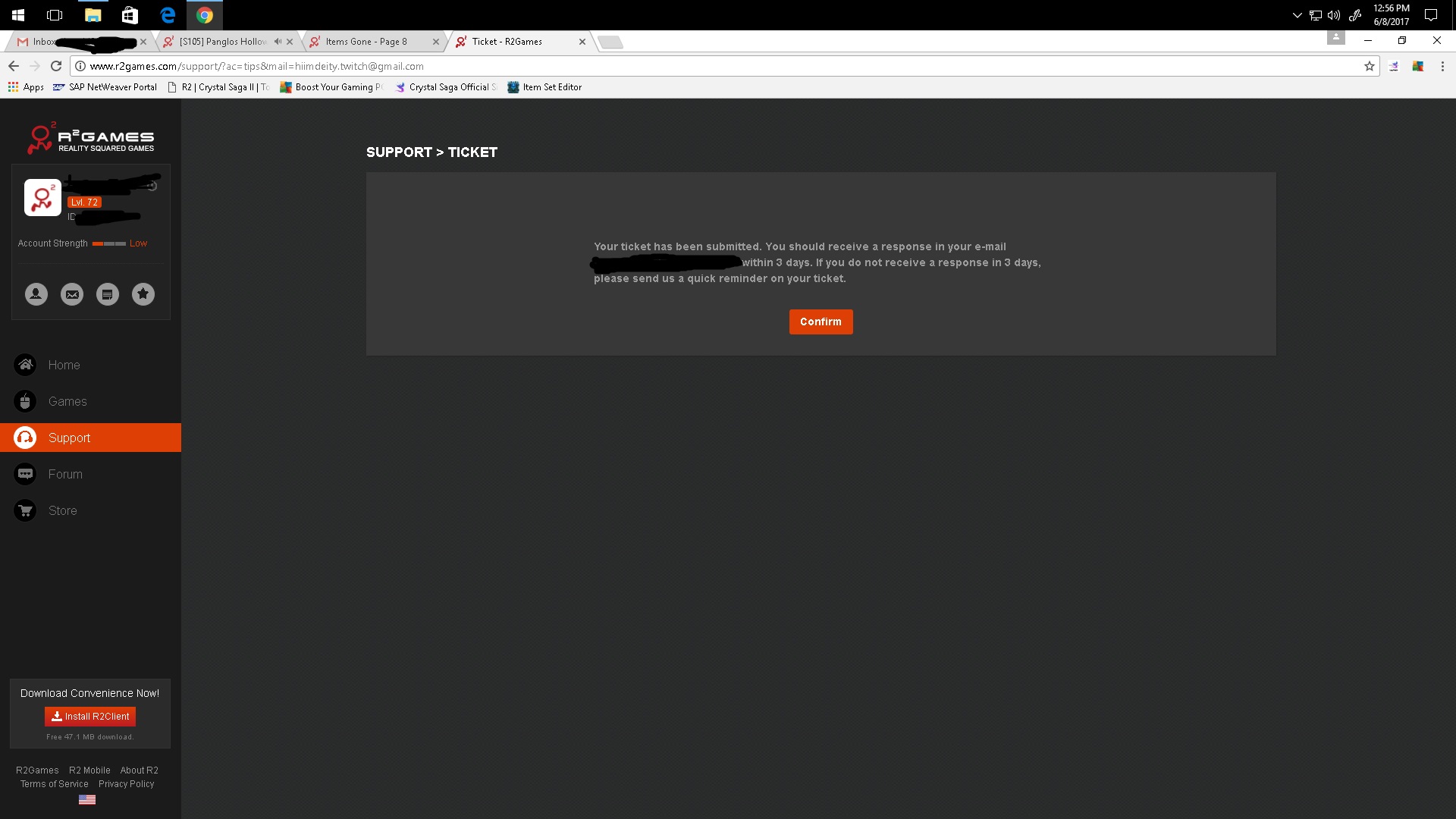 The R2 team will be issuing a rollback for those affected. After the rollback is done, and you are still missing items, please pm me your characters name and server so that we can get your items restored. A list of those characters that were affected have been forwarded and we hope to have your items restored soon. Thank you for continuing to be patient while we resolve this issue.Last edited by KanaDT; 06-08-2017, 09:52 AM.If your question wasn't answered, and you are still needing assistance, send a ticket