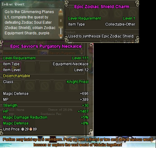 Well anyways, how those should be: Glimmering Plains, Epic Zodiac Shield Shard, Epic Saint's Purgatory Necklace, Vidalia.