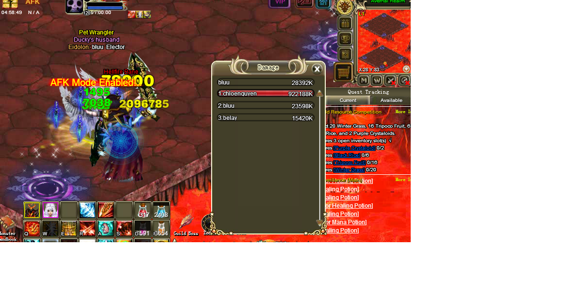 In the bottom one, you are at 23,598,000 damage. In the top one, you're up to 35,302,000. That means between screenshots you've racked up 11,704,000 damage. And between shots, the other guy did 12 million.
