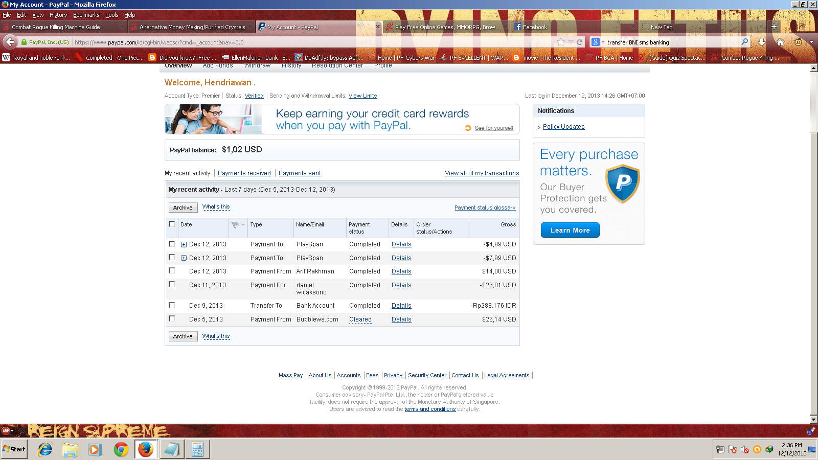 1. My Paypal Payments to playspan, $7.99 for VIP, $4.99 for the 500 crystals
