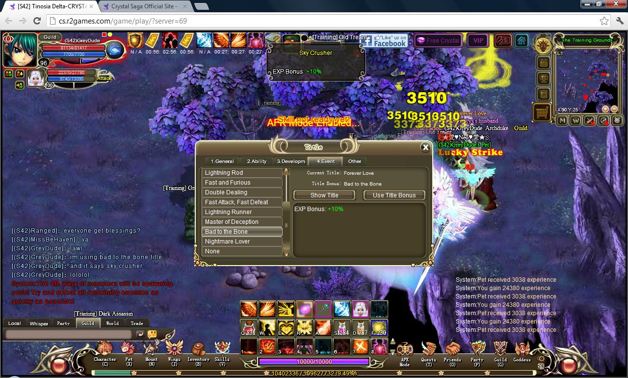 i went to training just a few mins ago and ofc im using title bonus "bad to the bone" for 10% more exp, but if you look on the buffs thing instead of showing bad to the bone shows "Sky crusher" and there's a title for sky crusher wich gives 8% crit damage or something like that, well my point is that idk if its only a typo or if instead of giving the exp its giving more crit still wanted to report this cuz even typo should be fixed sooner or later lol